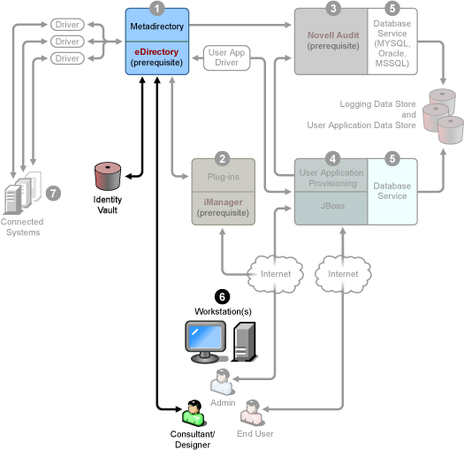 6. Workstations. Used for Designer to design, deploy, and document the Identity Manager system and for utilities, reports, and tools included with the product. To install Designer on a workstation, see Installing Designer in the Designer for Identity Manager 3: Administration Guide.