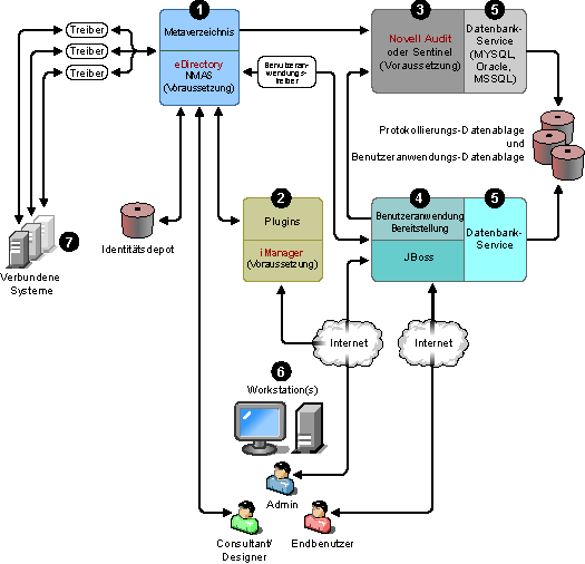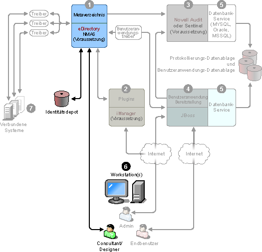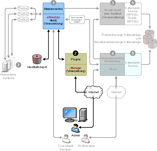 HINWEIS:Vor der Installation der Identity Manager-Komponenten muss zunächst die hierfür erforderliche Software installiert werden: eDirectory 8.7.3.6 oder höher (für die Services, die an den Positionen 1 und 3 in der obigen Grafik angezeigt werden), Security Services 2.0.4 mit NMAS™ 3.1.3 (für die Positionen 1 und 3), iManager 2.6 oder höher (für Position 2) und Novell Audit 2.0.2 Starter Pack oder Sentinel™ 5.1.3 (für Position 3). Sie können die erforderliche Software von der Download-Website von Novell herunterladen. Eine ausführliche Liste der Voraussetzungen und Anforderungen finden Sie in Abschnitt 1.5, Systemanforderungen für Identity Manager.