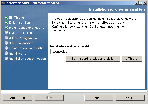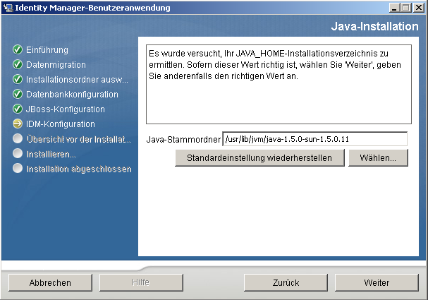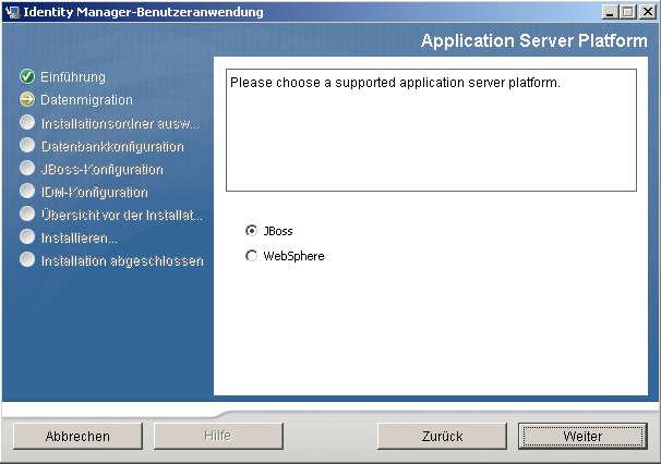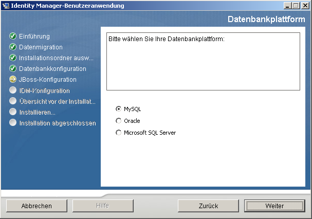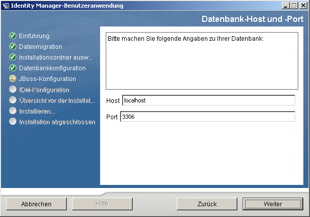 Bei diesem Installationsvorgang wird der JBoss-Anwendungsserver nicht installiert. Eine Anleitung für die Installation des JBoss-Anwendungsservers finden Sie in Abschnitt 5.1.1, Installation des JBoss-Anwendungsservers und der MySQL-Datenbank.