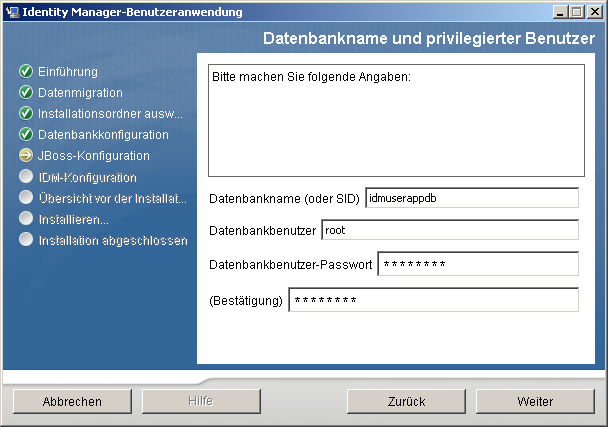 Klicken Sie auf und fahren Sie mit Abschnitt 5.5.8, Angabe des Datenbanknamens und des privilegierten Benutzers fort.