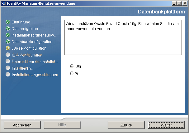 Bei Verwendung einer Oracle-Datenbank fragt Sie das Installationsprogramm nach deren Version. Wählen Sie die entsprechende Version aus.