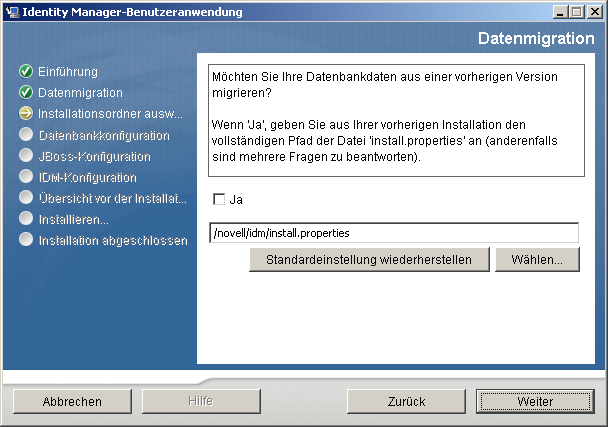 Wenn Sie den Speicherort der Datei install.properties von der vorherigen Installation angeben, verringert sich die Anzahl der Elemente, die Sie auf den folgenden Seiten festlegen müssen.