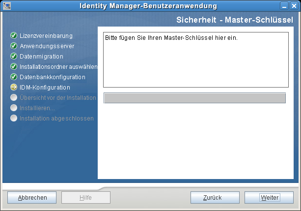 Wenn ein vorhandener verschlüsselter Master-Schlüssel importiert werden soll, kopieren Sie den Schlüssel und fügen Sie ihn in das Fenster des Installationsvorgangs ein.