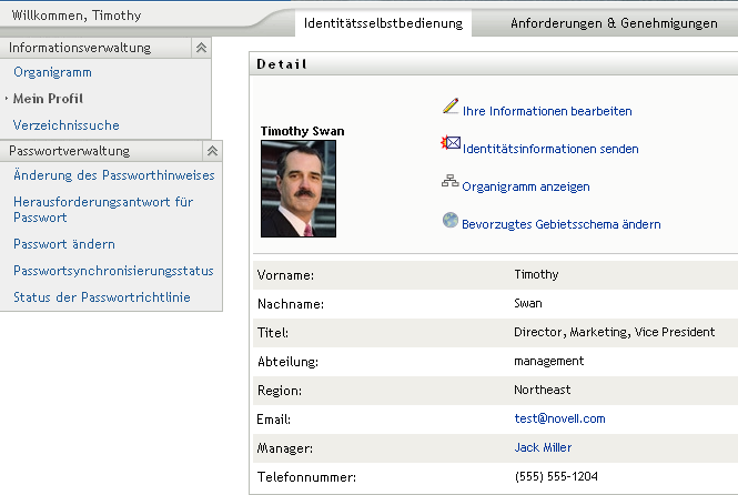 Im folgenden Beispiel wird dargestellt, wie ein Benutzer über Links Detailinformationen zu anderen Benutzern und Gruppen anzeigen kann. Timothy Swan (Vice President Marketing) meldet sich bei der Identity Manager-Benutzeranwendung an und ruft die Seite „Mein Profil“ auf: