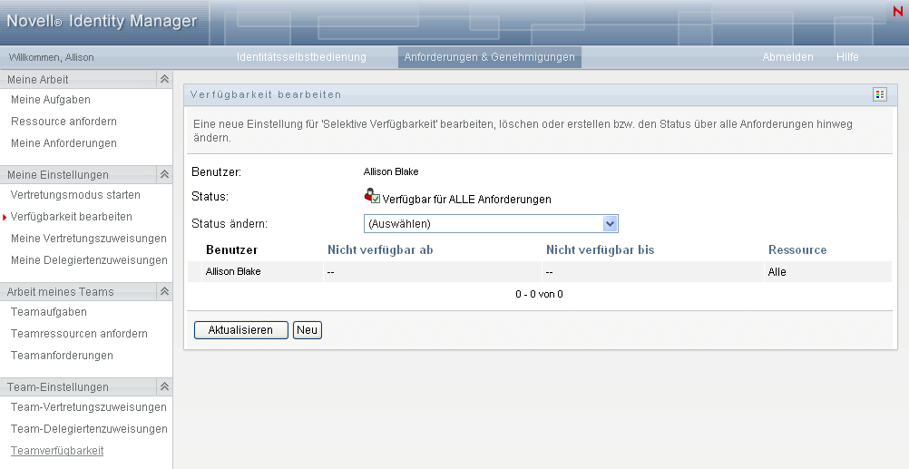 Wenn Ihnen keine Delegierten zugewiesen wurden, zeigt die Benutzeranwendung eine Meldung an, dass Sie Ihren Status auf der Seite „Verfügbarkeit bearbeiten“ nicht ändern können.