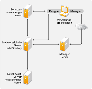 Auf Basis der in Designer gesammelten Informationen können Sie zu jeder Komponente von Identity Manager technische Entscheidungen treffen, z. B. über den Installationsspeicherort und Konfigurationsoptionen. Eine Einführung zu jeder Komponente finden Sie im Handbuch Überblick über Identity Manager 3.6.1. Abbildung 3-1 ist eine mögliche Konfiguration einer Identity Manager-Lösung.