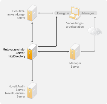 Abhängig von der Arbeitslast des Servers können Sie einen oder mehrere Metaverzeichnis-Server einsetzen. Für den Metaverzeichnis-Server ist es erforderlich, dass eDirectory installiert ist, wie in Abbildung 3-3 dargestellt. Sie können einen Remote Loader-Server hinzufügen (in der Abbildung nicht dargestellt), damit die Arbeitslast bzw. die Konfiguration Ihrer Umgebung besser bewältigt werden kann.