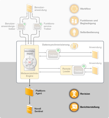 Die Revision und die Berichterstellung werden durch die Integration mit Novell Sentinel™ ermöglicht, wie im folgenden Diagramm dargestellt.