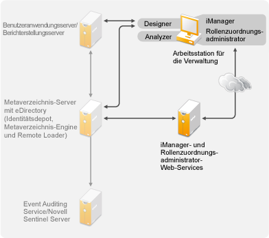 Die beiden Verwaltungswerkzeuge für die Identity Manager-Lösung sind Designer und iManager, wie in Abbildung 3-2 dargestellt. Designer wird für die Planung und Erstellung und iManager für die täglichen Verwaltungsaufgaben der Identity Manager-Lösung verwendet.
