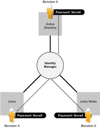 Im Rahmen der Datensynchronisierungsfunktion kann Identity Manager Sie auch bei der Synchronisierung von Passwörtern zwischen verschiedenen Systemen unterstützen. Wenn ein Benutzer beispielsweise sein Passwort in Active Directory ändert, kann Identity Manager diese Änderung an Lotus Notes und Linux weitergeben.