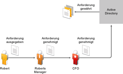 Die Selbstbedienungsfunktion von Identity Manager wird nicht nur von Robert dazu verwendet, Zugriff auf die benötigten Dokumente anzufordern, sondern auch sein Vorgesetzter und der Leiter der Finanzabteilung verwenden sie für die Genehmigung der Anforderung. Der eingerichtete Genehmigungsworkflow ermöglicht Robert, seine Anforderung zu initiieren und ihren Fortschritt zu überwachen, und Roberts Vorgesetztem und dem Leiter der Finanzabteilung, auf seine Anforderung zu antworten. Wenn die Anforderung von Roberts Vorgesetztem und dem Leiter der Finanzabteilung genehmigt wird, veranlasst dies die Bereitstellung der von Robert zum Zugriff und zur Ansicht der Finanzdokumente benötigten Active Directory-Rechte.
