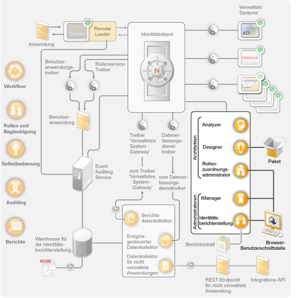 Mit iManager können Sie dieselben Aufgaben wie mit Designer durchführen und zudem den Zustand Ihres Systems überwachen. Die Paketverwaltung wird in iManager jedoch nicht unterstützt. Es ist empfehlenswert, iManager für Verwaltungsaufgaben und Designer für Konfigurationsaufgaben, die Änderungen an Paketen, Modellierung und Tests vor der Bereitstellung erfordern, zu verwenden.