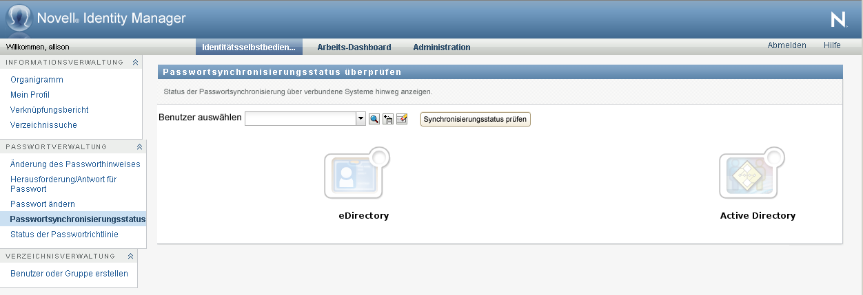 Auf der Seite „Passwortsynchronisierungsstatus“ können Sie überprüfen, ob Ihr Passwort mit anderen Anwendungen synchronisiert wurde. Verwenden Sie eine andere Anwendung nur nach erfolgter Synchronisierung Ihres Passworts. Der Zugriff auf Anwendungen, die noch nicht vollständig synchronisiert wurden, kann zu Zugriffsproblemen führen.