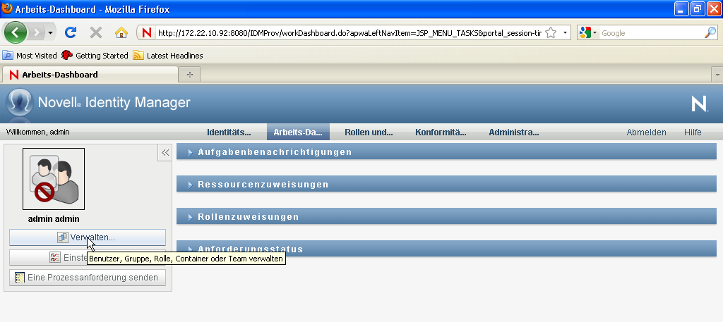 Wenn Sie einen Benutzer, eine Gruppe, einen Container, eine Rolle oder ein Team auswählen, aktiviert das Arbeits-Dashboard den Verwaltungsmodus und aktualisiert den Abschnitt „Benutzerprofil“ im linken Bildschirmbereich. Die Anzeige des Benutzerprofils wird wie folgt aktualisiert: