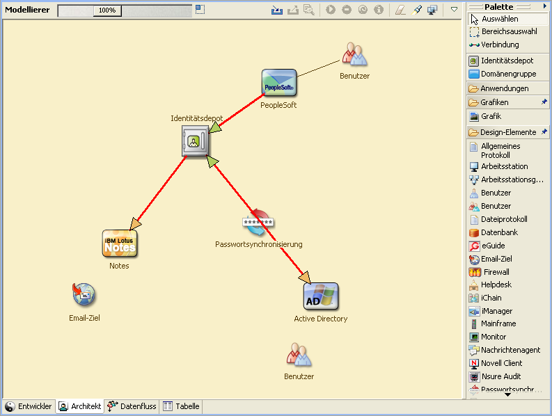 Identity Manager automatisiert Geschäftsprozesse, damit Identitäten in Ihrer Umgebung einfach verwaltet werden können. Wenn Sie die aktuellen Geschäftsprozesse nicht kennen, können Sie keine Identity Manager-Lösung entwerfen, die diese Prozesse automatisiert. Im Architektenmodus von Designer können Sie Ihre aktuellen Geschäftsprozesse erfassen und diese grafisch darstellen. Weitere Informationen finden Sie unter Architect Mode