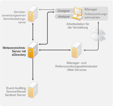 Abhängig von der Arbeitslast des Servers können Sie einen oder mehrere Metaverzeichnis-Server einsetzen. Für den Metaverzeichnis-Server ist es erforderlich, dass eDirectory installiert ist, wie in Abbildung 3-3 dargestellt. Sie können einen Remote Loader-Server hinzufügen (in der Abbildung nicht dargestellt), damit die Arbeitslast bzw. die Konfiguration Ihrer Umgebung besser bewältigt werden kann.