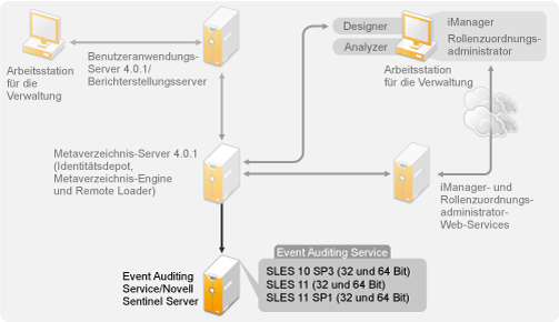Das Identitätsberichterstellungsmodul ist eine Komponente von Identity Manager 4.0.1. Novell Sentinel ist nicht im Lieferumfang von Identity Manager enthalten, sondern kann als optionale Komponente zum Identity Manager-System hinzugefügt werden.