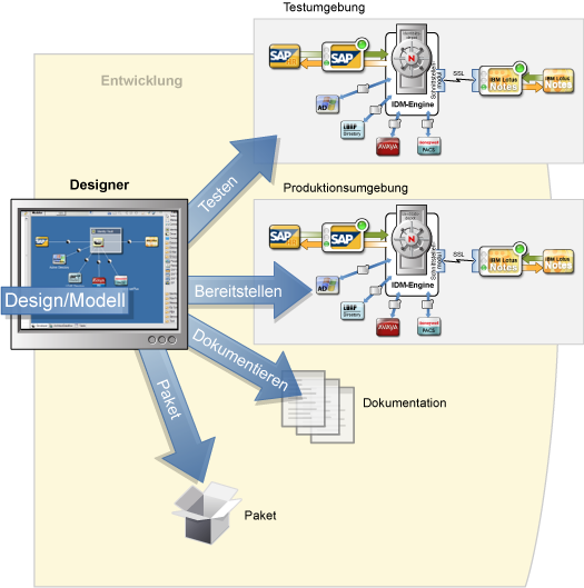 Designer ist ein Eclipse-basiertes Werkzeug, mit dessen Hilfe Sie das Identity Manager-System entwerfen, bereitstellen und dokumentieren können. Mit der grafischen Schnittstelle von Designer können Sie Ihr System in einer Offline-Umgebung entwerfen und testen, das System in Ihrer Produktionsumgebung bereitstellen und alle Details Ihres bereitgestellten Systems dokumentieren.