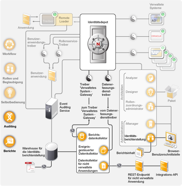 Revision und Berichterstellung stehen über das Identitätsberichterstellungsmodul, eine neue Funktion von Identity Manager 4.0.1, zur Verfügung (siehe nachfolgendes Diagramm).