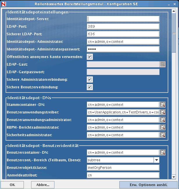 Die Standardansicht des Konfigurationsfensters für das rollenbasierte Bereitstellungsmodul enthält diese Felder: