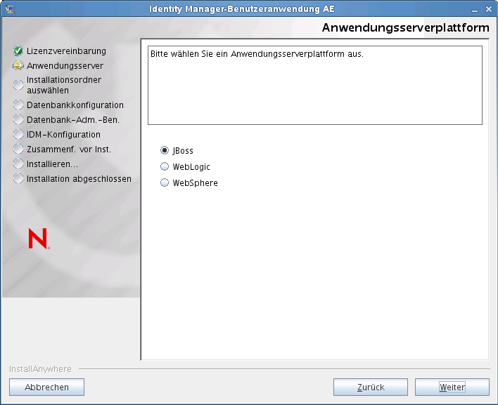 HINWEIS:Im Falle von JBoss 5.1.0 benötigt das Installationsprogramm die Java 2 Platform Standard Edition Development Kit Version 1.6 (JRE oder JDK) von Sun. Wenn Sie eine andere Version verwenden, wird die Benutzeranwendungs-WAR-Datei von der Installationsprozedur nicht korrekt konfiguriert. Die Installation scheint erfolgreich zu verlaufen, Sie erhalten aber Fehlermeldungen, wenn Sie die Benutzeranwendung starten.