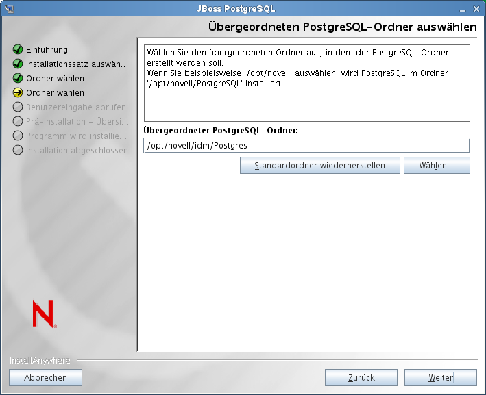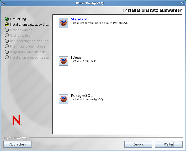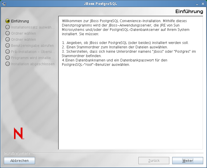 Das JBossPostgreSQL-Dienstprogramm installiert den JBoss-Anwendungsserver und PostgreSQL auf Ihrem System. Dieses Dienstprogramm unterstützt keinen Konsolenmodus, sondern erfordert eine grafische Benutzeroberflächenumgebung.