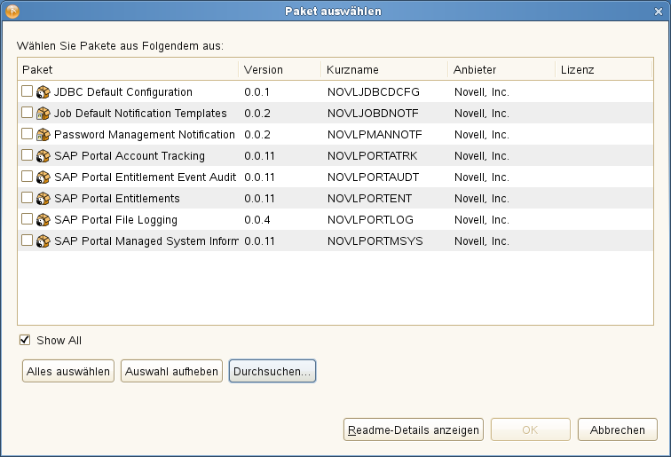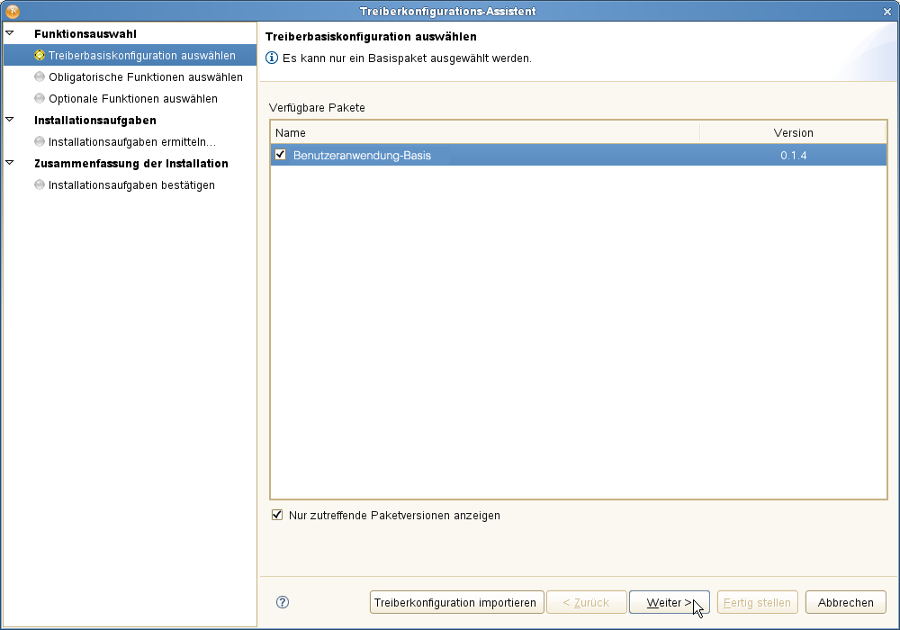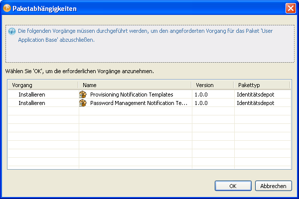 Bevor Sie versuchen, die Treiber zu konfigurieren, müssen Sie sicherstellen, dass Sie alle erforderlichen Pakete im Paketkatalog haben. Wenn Sie ein neues Identity Manager-Projekt erstellen, werden Sie automatisch dazu aufgefordert, mehrere Pakete in das neue Projekt zu importieren. Wenn Sie die Pakete nicht beim Erstellen Ihres Projekts importieren möchten, müssen Sie sie zu einem späteren Zeitpunkt installieren, wie nachfolgend beschrieben.