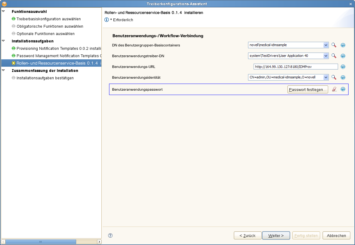 Geben Sie die ID und das Passwort für den Benutzeranwendungsadministrator sowie den Host, Port und Anwendungskontext für den Benutzeranwendungs-Server an. Wenn Sie möchten, dass der Bereitstellungsadministrator Workflows im Namen einer anderen Person starten darf, für die der Bereitstellungsadministrator als Vertretung designiert wurde, wählen Sie für :