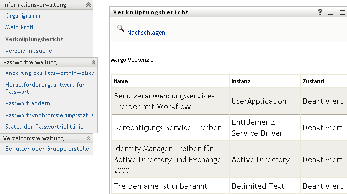 Anwendungs- oder Systemnamen, für die der Benutzer eine Verknüpfung in der DirXML-Verknüpfungstabelle im Identitätsdepot hat. (Die Verknüpfungstabelle wird gefüllt, wenn das Identitätsdepot ein Benutzerkonto mit einem verbundenen System über eine Richtlinie oder Berechtigung synchronisiert.)