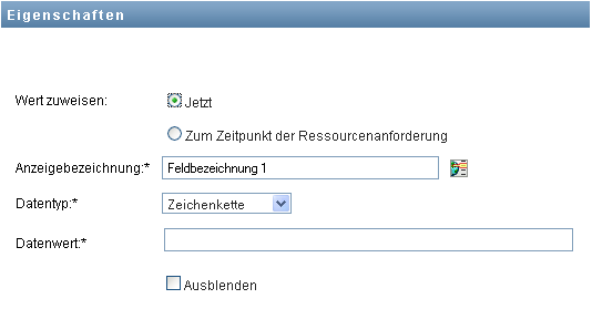 Geben Sie eine Anzeigebezeichnung für das Feld sowie den Datentyp und -wert an. Die folgenden Datentypen werden unterstützt:
