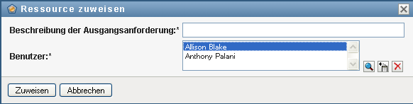 Die Felder und sind erforderliche Felder, die in allen Ressourcenanforderungsformularen enthalten sind. Sie können mithilfe der Objektauswahl die Benutzer für die Ressourcenzuweisung auswählen.