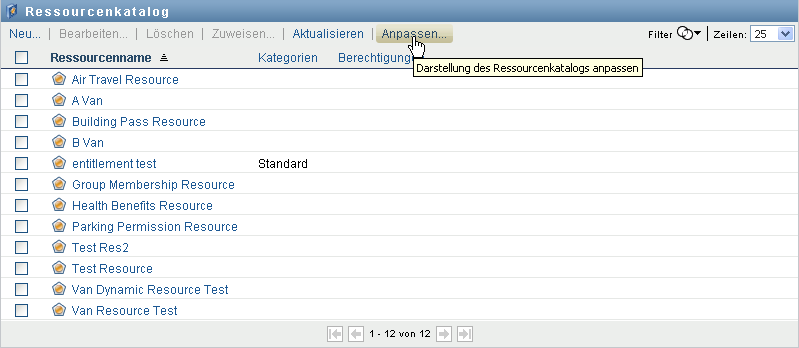 In der Benutzeranwendung wird eine Liste der derzeit im Katalog definierten Ressourcen angezeigt.