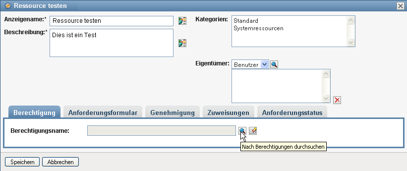 Der Text, der verwendet wird, wenn der Ressourcenname in der Benutzeranwendung angezeigt wird. Wenn Sie eine Ressource erstellen, darf der folgende Zeichen nicht enthalten: < > , ; \ " + # = / | & * Sie können diesen Namen in alle von der Benutzeranwendung unterstützten Sprachen übersetzen. Weitere Informationen finden Sie in Tabelle 1-1, Allgemeine Schaltflächen. |