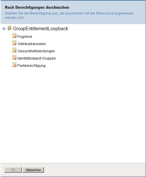 HINWEIS:Wenn Sie die DirXML-Ressource nicht ordnungsgemäß konfiguriert haben, wird beim Zugriff auf die Seite zur Auswahl einer Berechtigung eine Meldung angezeigt, die angibt, dass Sie Ihre Berechtigungen nicht für die Ressourcenzuordnung konfiguriert haben.