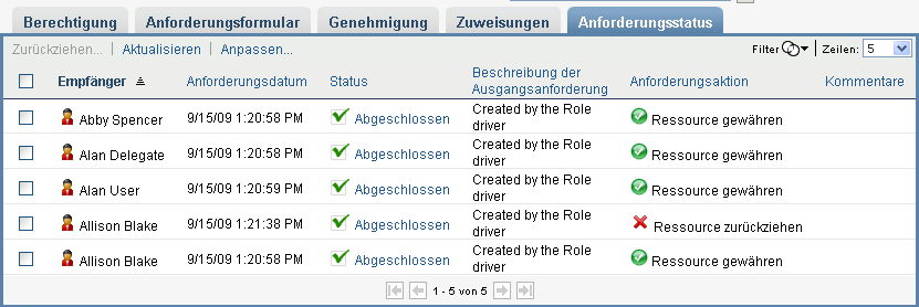Die Aktion zeigt alle Ressourcenzuweisungsanforderungen an, einschließlich derer, die laufen, auf Genehmigung warten bzw. genehmigt, abgeschlossen, verweigert oder abgebrochen wurden.