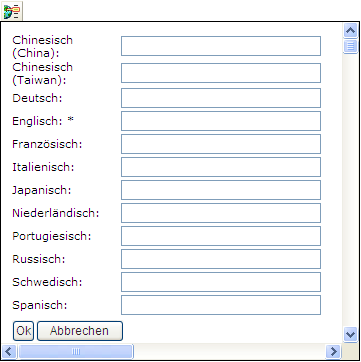 Lokalisieren. Zeigt ein Dialogfeld an, in dem Sie den Text für einen Feldnamen oder eine Beschreibung in einer beliebigen der zurzeit von der Benutzeranwendung unterstützten Gebietsschemata eingeben.