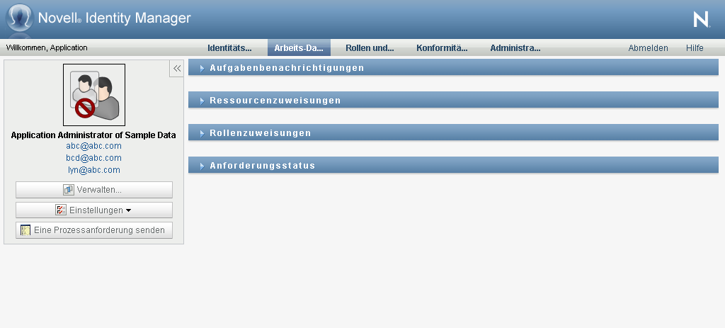 Nach der Anmeldung zeigt die Identity Manager-Benutzeranwendung die Registerkarten an, mit denen Sie arbeiten: