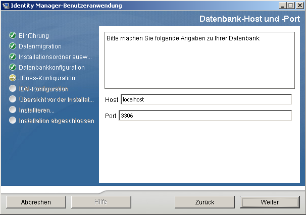 Sie werden aufgefordert, den Datenbanktyp, den Hostnamen und den Port zu bestätigen. Bestätigen Sie diese Angaben und klicken Sie auf .