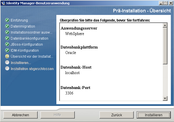 Wenn Sie die gewünschten Änderungen an den Installations- und Konfigurationsparametern vorgenommen haben, kehren Sie zur Seite „Prä-Installation - Übersicht“ zurück und klicken Sie auf .