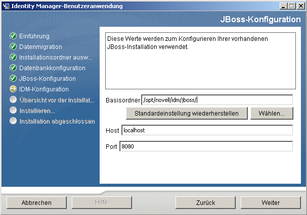 Bei diesem Installationsvorgang wird der JBoss-Anwendungsserver nicht installiert. Eine Anleitung für die Installation des JBoss-Anwendungsservers finden Sie in Abschnitt 2.3.1, Installation des JBoss-Anwendungsservers und der MySQL-Datenbank.