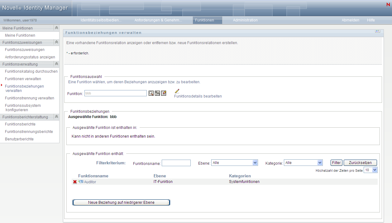 Funktionen der untersten Ebene (Berechtigungsfunktionen) können in Funktionen höherer Ebene enthalten sein, aber keine weiteren Funktionen der untersten Ebene enthalten. Auf der Seite "Funktionsbeziehung" können Sie nur eine neue Funktion höherer Ebene hinzufügen.