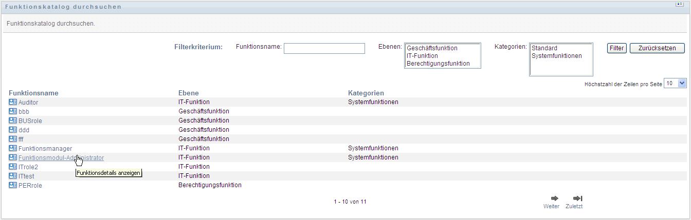 Die Benutzeranwendung zeigt die aktuelle Liste der Funktionen im Funktionskatalog an.