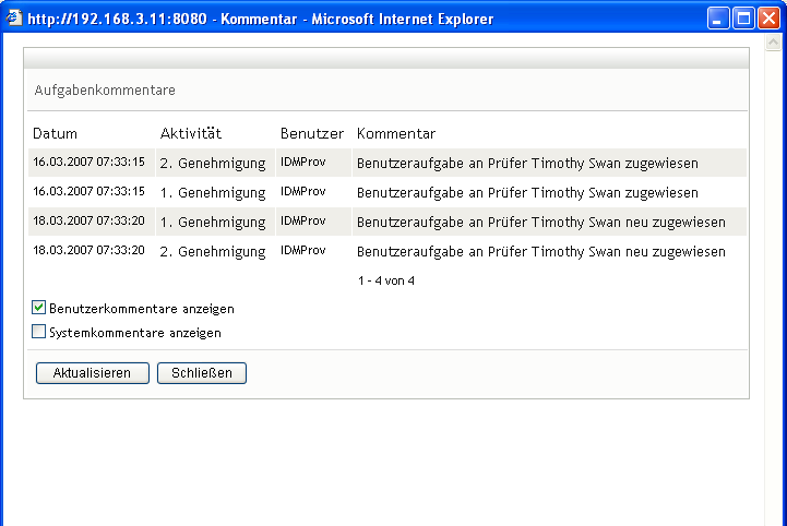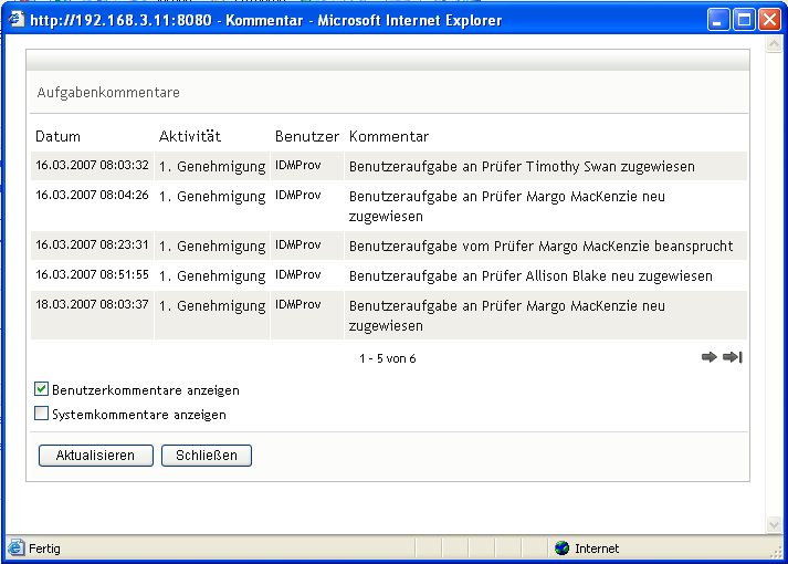 Im daraufhin eingeblendeten Fenster können Sie Benutzer- und Systemkommentare sehen. Die Reihenfolge der angezeigten Kommentare hängt von dem mit jedem Kommentar verknüpften Zeitstempel ab. Die ältesten Kommentare werden zuerst angezeigt. Bei parallel stattfindenden Genehmigungs-Workflows kann die Reihenfolge der gleichzeitig verarbeiteten Aktivitäten unvorhersehbar sein.