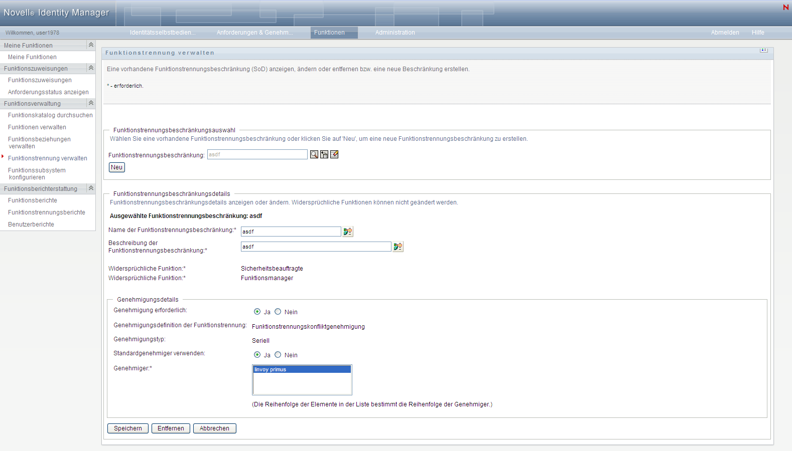 Weitere Informationen zum Ausfüllen der Felder finden Sie unter Tabelle 17-5, Funktionstrennungsbeschränkungsdetails und Tabelle 17-6, Genehmigungsdetails.
