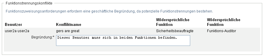 Falls ein Funktionstrennungskonflikt auftritt, wenn eine Funktion dem aktuell ausgewählten Benutzer zugewiesen wird, zeigt die Benutzeroberfläche das Feld Funktionstrennungskonflikte unten auf der Seite an. In diesem Fall müssen Sie eine geschäftliche Begründung für die Funktionszuweisung abgeben.