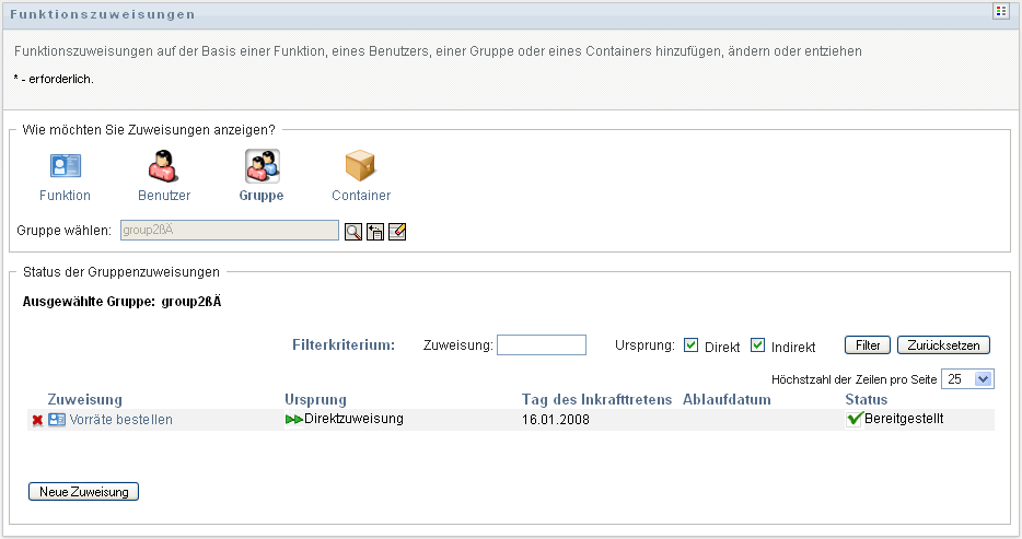 • Die Spalte Zuweisung liefert den Namen der der aktuellen Gruppe zugewiesenen Funktion.
