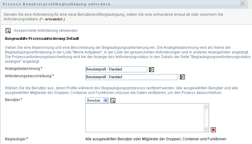 Sie müssen mindestens einen Benutzer, eine Gruppe, eine Funktion oder einen Container auswählen, um einen Beglaubigungsprozess starten zu können. Zum Speichern einer Anforderung ist dies jedoch nicht erforderlich.