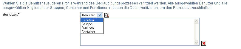 Beachten Sie, dass der Text im Feld schreibgeschützt ist. Bei einem Benutzerprofilbeglaubigungsprozess sind die Beglaubiger die Benutzer, die im Feld ausgewählt sind, zusammen mit allen Mitgliedern der Gruppen, Funktionen und Container, die Sie im Feld hinzugefügt haben. Dies liegt daran, dass jeder Benutzer der Beglaubiger seines eigenen Profils sein muss.