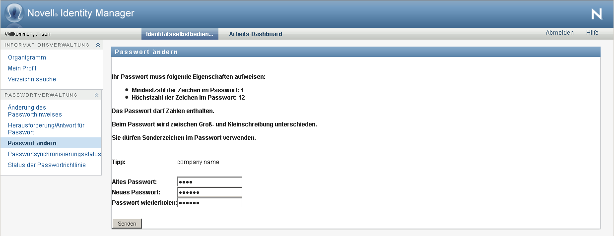 Auf dieser Seite können Sie jederzeit Ihr Passwort ändern, sofern der Systemadministrator Ihnen die hierfür erforderliche Berechtigung erteilt hat.