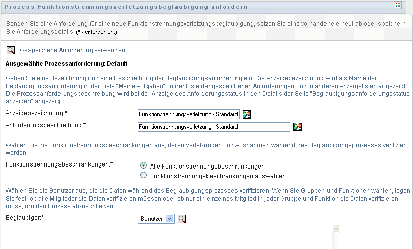 Sie müssen mindestens einen Benutzer, eine Gruppe oder eine Rolle als Beglaubiger auswählen, um einen Beglaubigungsprozess starten zu können. Zum Speichern einer Anforderung ist dies jedoch nicht erforderlich.